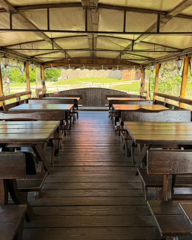 - Apsauga nuo lietaus ir vėjo – Mūsų laive visada bus šilta ir jauku. Esant lietingam ar vėjuotam orui laivas yra uždengiamas skaidriais tentais. Taip pat laive visada rasite šiltus ir švelnius pledus. Jūsų laukia malonus plaukimas bet kokiu oru.
